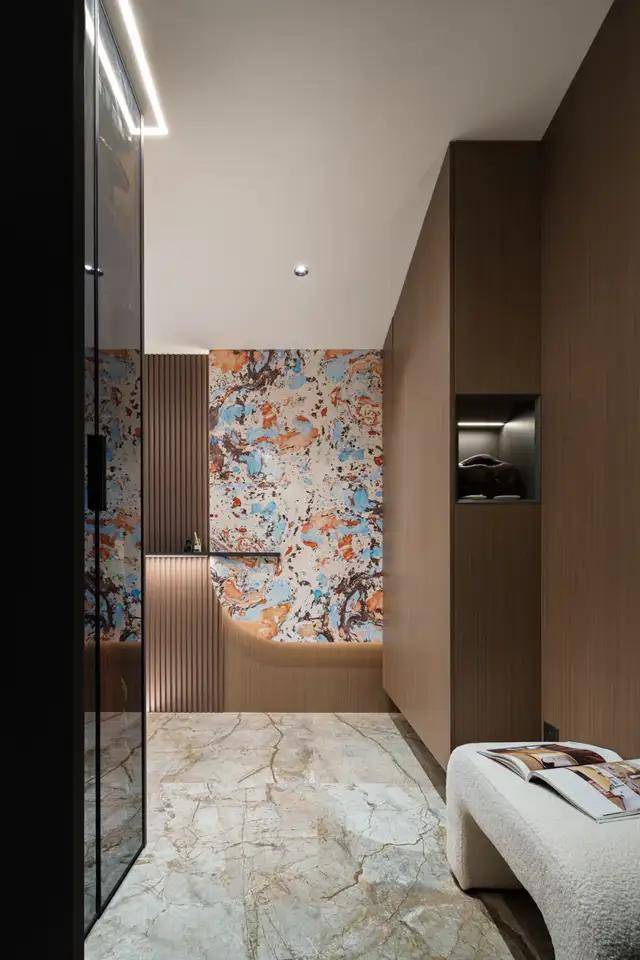 整体以温润的胡桃木色为主基调,通过局部色彩点缀勾勒出入户的第一重仪式感。