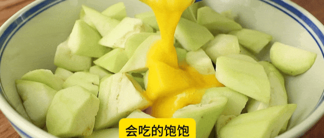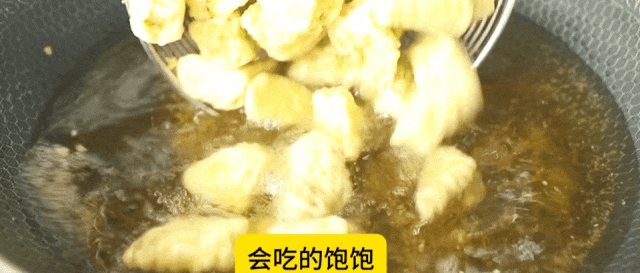 9️⃣往锅里多倒一些油,烧至油冒出小气泡,就来一块块地下入茄子,用中小火给它慢慢的炸,炸的过程中,用筷子给它搅一搅,让茄子块受热均匀了,颜色变成金黄色就捞出来。