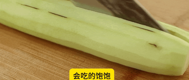 2️⃣茄子削去表皮后,用刀将它一分为二,再来改刀切成滚刀块,切成滚刀状的茄子,形状更好看,烹饪的时候会非常的软绵入味。