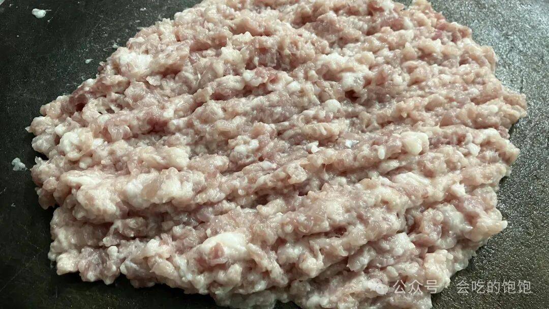 4️⃣用了350克的前腿肉,属于八分瘦二分胖的肉质,将猪肉清洗干净后,用刀撇去猪皮,再将它切成小块,然后,用刀反复多次地剁一剁,大约剁了3分多钟,剁成带点肉粒的状态,口感会更香些。