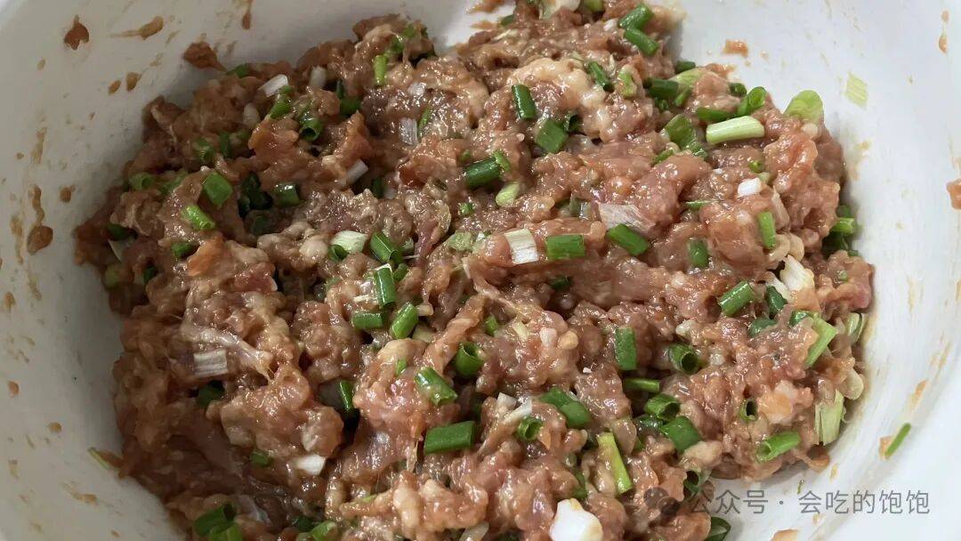 6️⃣为了肉馅更滑嫩喷香,往肉末里,再加入一小把葱花,少量的食用油,继续用筷子搅拌,搅拌至肉馅上劲,看起来有些粘手的状态。